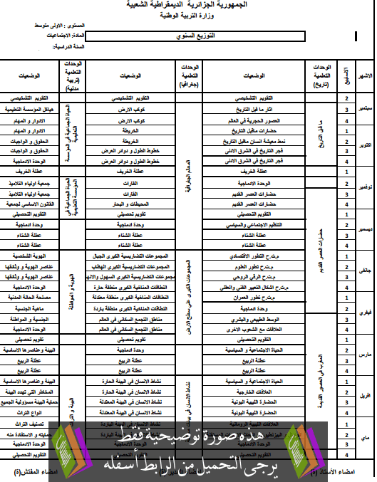 الرئيسية » بستان المعلم » التعليم المتوسط » السنة الأولى » التوزيع السنوي التوزيع السنوي في الاجتماعيات الآولى متوسط التوزيع السنوي في مادة الاجتماعيات (التاريخ، الجغرافيا، التربية المدنية)، لأساتذة السنة الأولى من التعليم المتوسط. صورة توضيحية: تحميل التوزيع السنوي في الاجتماعيات الآولى متوسط: التوزيع السنوي في الاجتماعيات الآولى متوسط عدد مرات التحميل: 1573 حجم الملف: 35 KiB